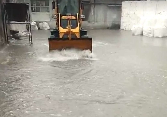 为了避免积水流入库内,排水人员先在各货场内打上沙坝,避免积水流入库内,用水桶将积水倒入1M3的塑料桶内再由叉车转至货场外。大家明确分工,齐心合力,通过各种办法疏通货场和库房积水。可西货场四周比较封闭,排水难度大,积水越积越多,眼看40cm高的沙坝马上要冲塌,雨水就要灌入库房,排水人员集中生智,就地取材,用棚膜和枕木搭建了一条简易排水渠道,将雨水疏导出货场;备件库房地势低,大量雨水倒灌库房,而库中存放电机等重要设备,物资抢救迫在眉睫,紧急调配了2台抽水泵进行排水。
