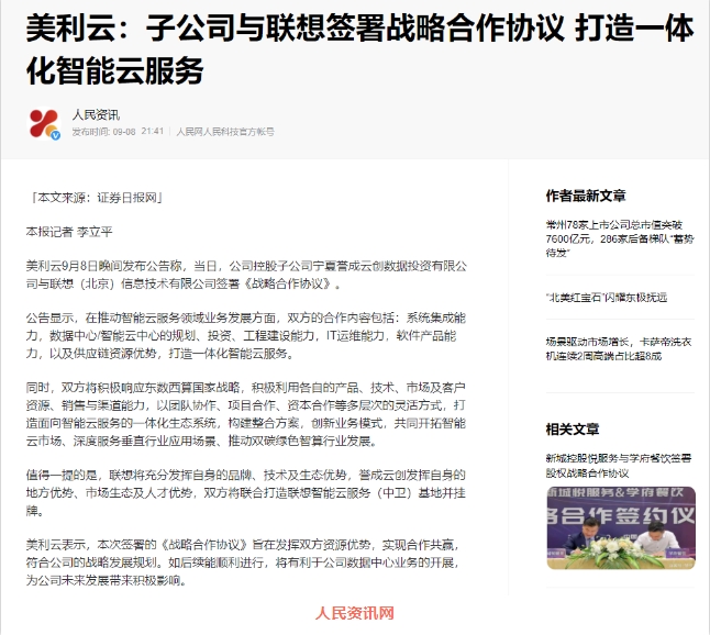 美利云党委书记、总经理任林,副总经理、誉成云创总经理刘金毅,誉成云创副总经理陈金兴,誉成云创业务总监李志刚;联想基础设施方案业务集团(ISG)中国区服务方案业务总经理刘淼、业务产品总监陈峰等参加了上述签约。