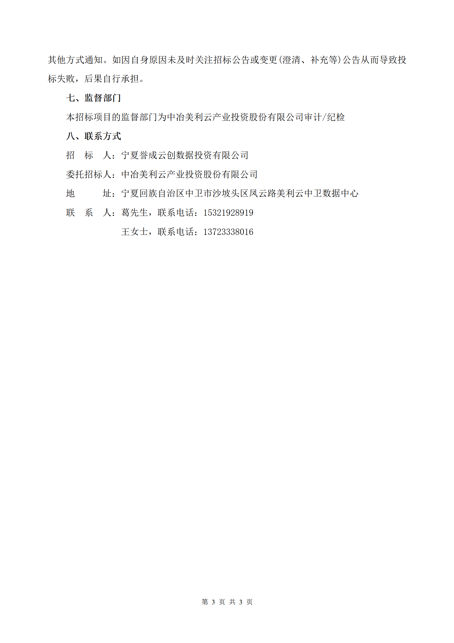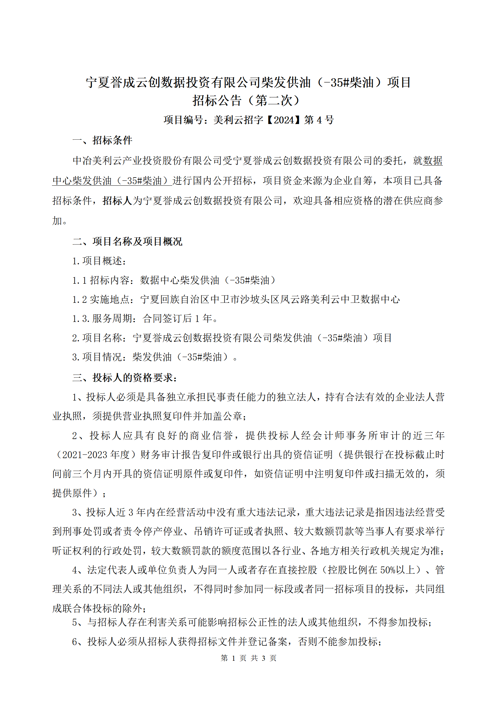 宁夏誉成云创数据投资有限公司柴发供油(-35#柴油)项目,招标人为宁夏誉成云创数据投资有限公司,委托招标人为中冶美利云产业投资股份有限公司。本项目于2024年9月30日至2024年10月13日报名获取招标文件,2024年10月21日上午 9:30 分截止投标、开标,由于截止至开标时间,递交投标文件的投标人不足三家,根据相关规定,本次公开招标流标。现招标文件二次确定招标时间与招标地点。现需在“美利云采购信息公众号”与“美利云公司官网”发布招标公告(第二次)。